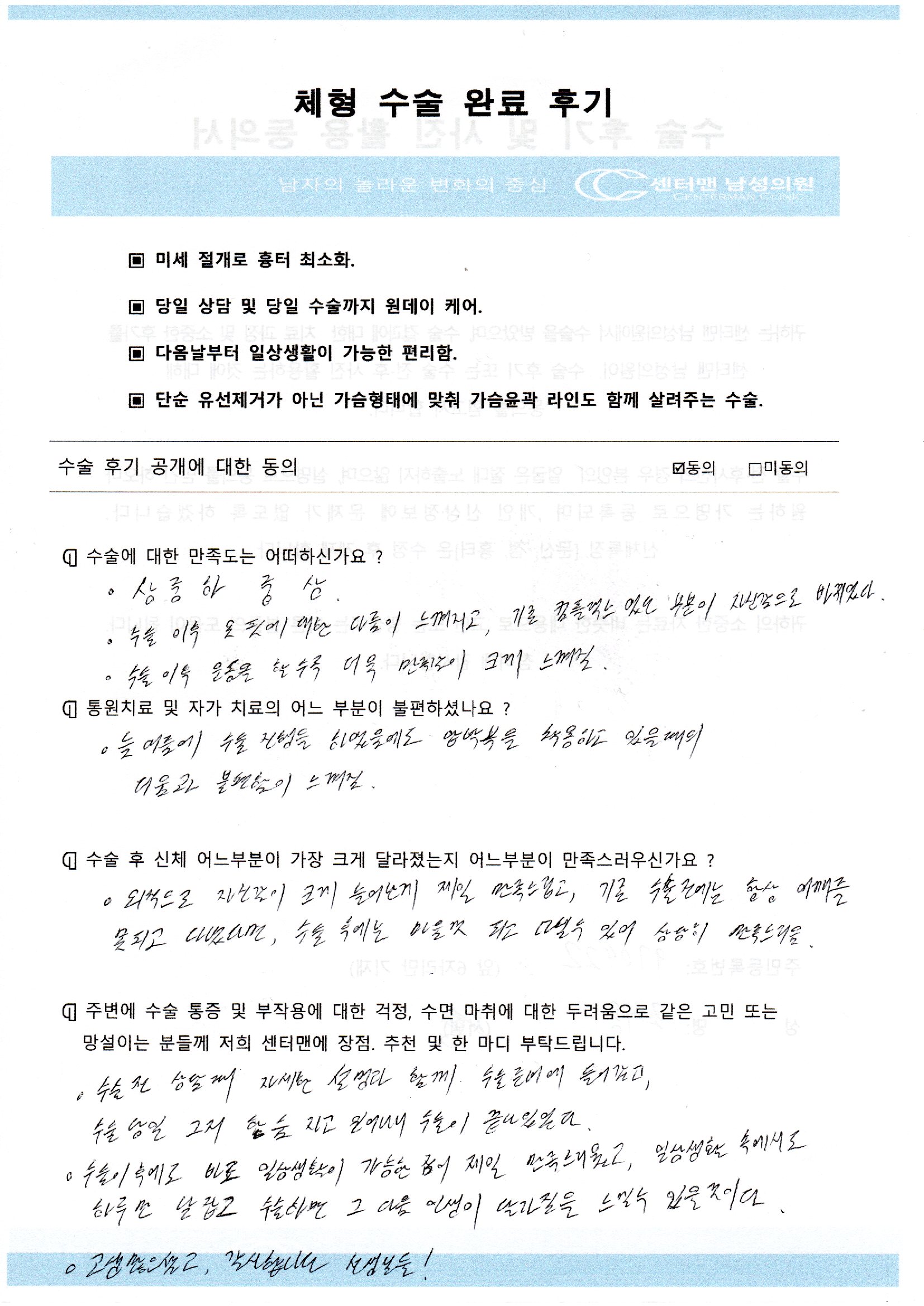 | 조**님 여성형 유방증 수술후 자필후기 | ||||||