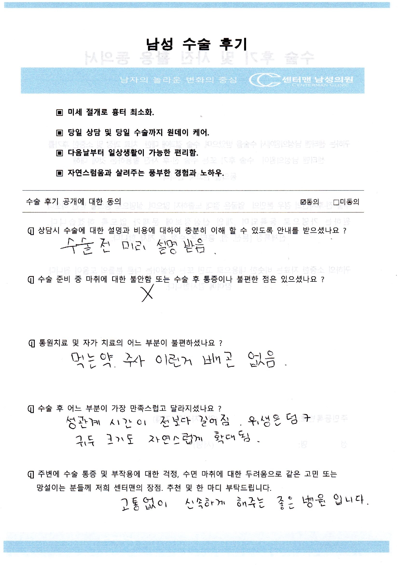 조**님 조루(배부신경차단술)및 귀두확대(자가지방),포경수술후 자필후기